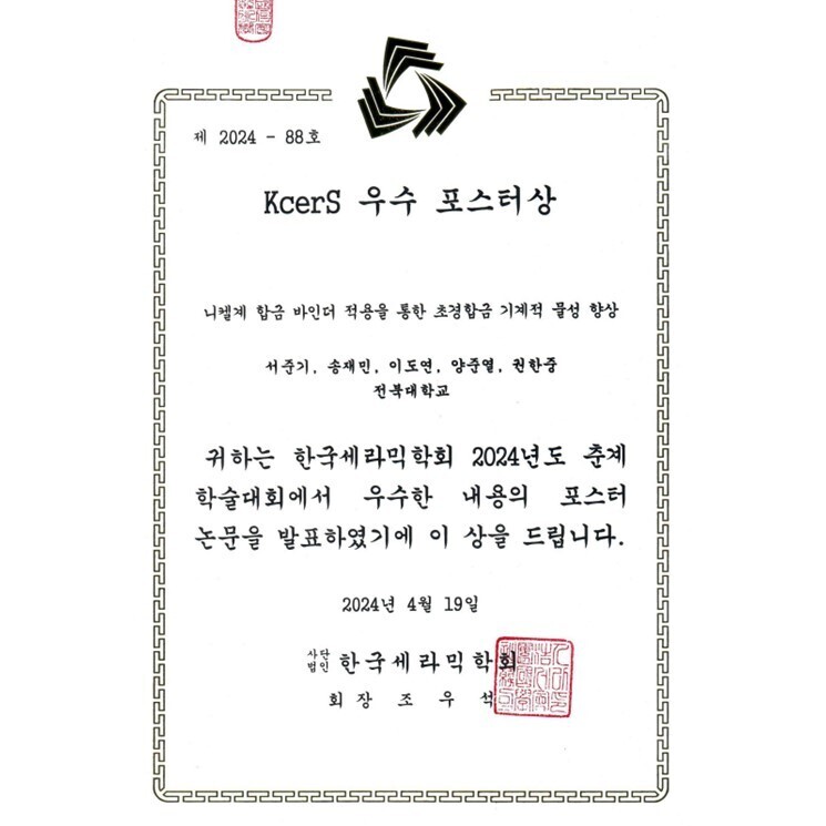 | 이도연 석사과정 (대한금속재료학회 비철금속분과 장학생 선정) (0) | 2025.01.03 |