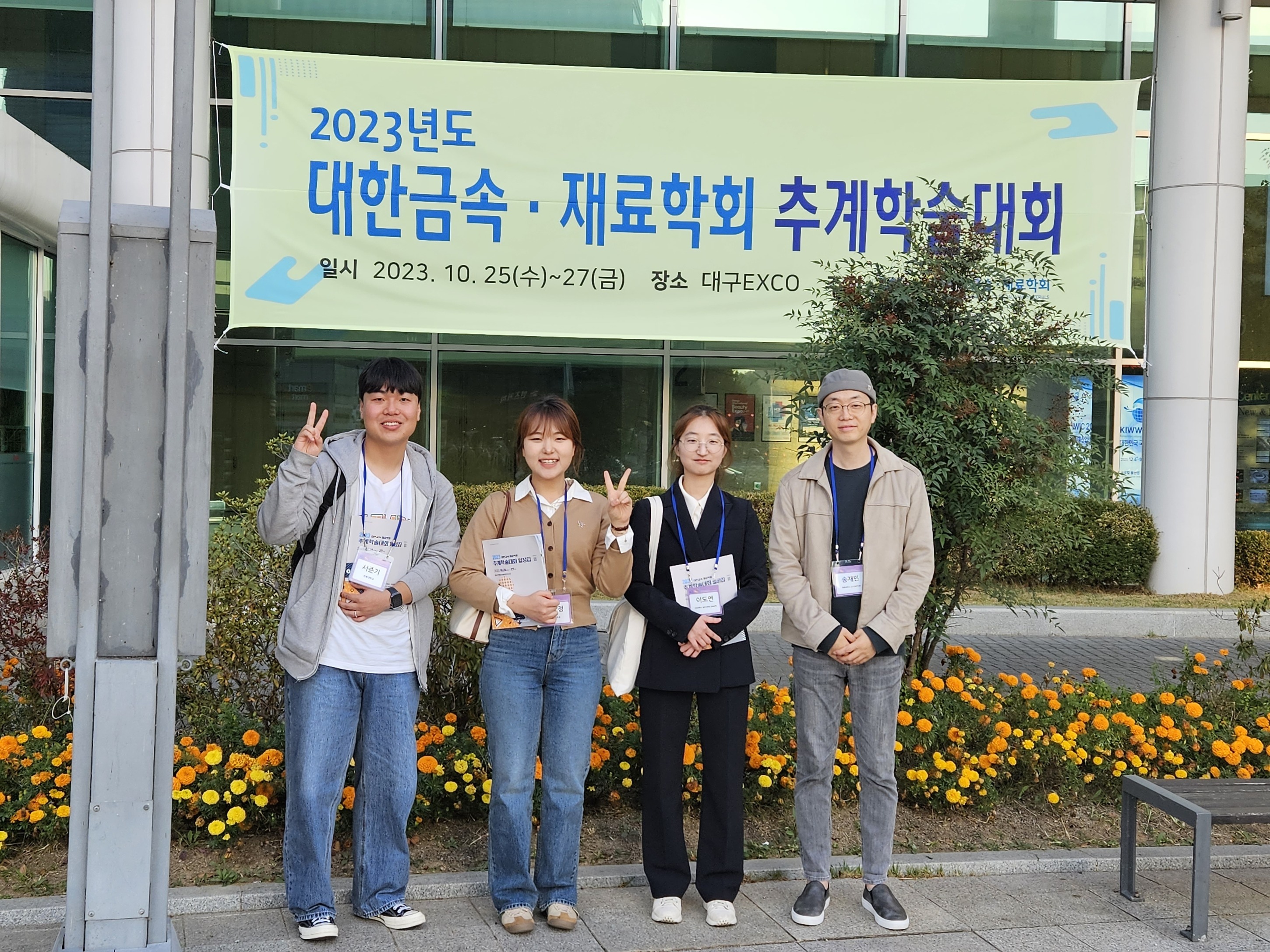 23년도 대구 코엑스에서 열린 추계 금속재료학회에서 도연, 준기 학생은 처음이라 긴장되는 시간임에도 불구하고 그동안 고생한 결과를 외부에 멋지게 선보인 자리가 되었고, 효정 학생도 관심 분야에 대해 탐색할 수 있는 기회를 가졌습니다.